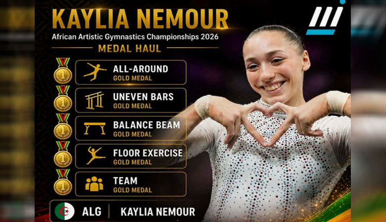 قدمت البطلة الجزائرية كيليا نمور عرضًا أسطوريًا في البطولة الإفريقية للجمباز الفني، بعدما فرضت سيطرتها المطلقة بحصد خمس ميداليات ذهبية كاملة، في إنجاز غير مسبوق يعكس موهبتها الاستثنائية. وتألقت نمور في مختلف الاختصاصات، حيث توجت بذهبية الفردي العام، والمتوازي مختلف الارتفاعات، وعارضة التوازن، والحركات الأرضية، إضافة إلى ذهبية الفرق، لتقود بذلك المنتخب الجزائري إلى هيمنة واضحة على منافسات السيدات.
